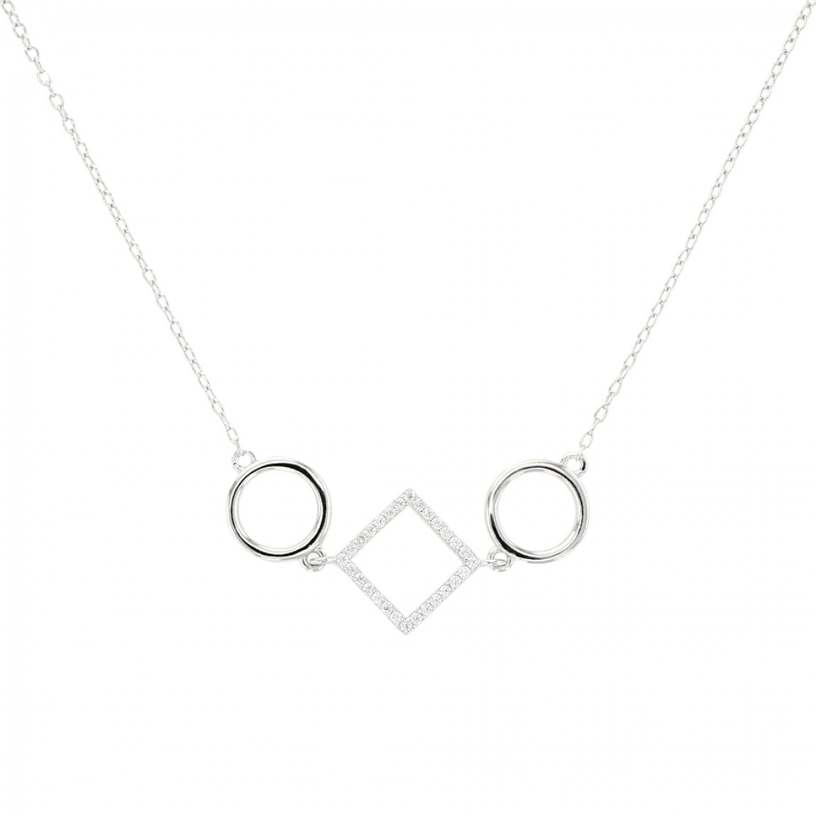 This sterling silver necklace features a sparkling CZ encrusted square linked with polished silver circles on either side. This necklace has an adjustable chain which can be worn as a length of 16 – 18 inches.